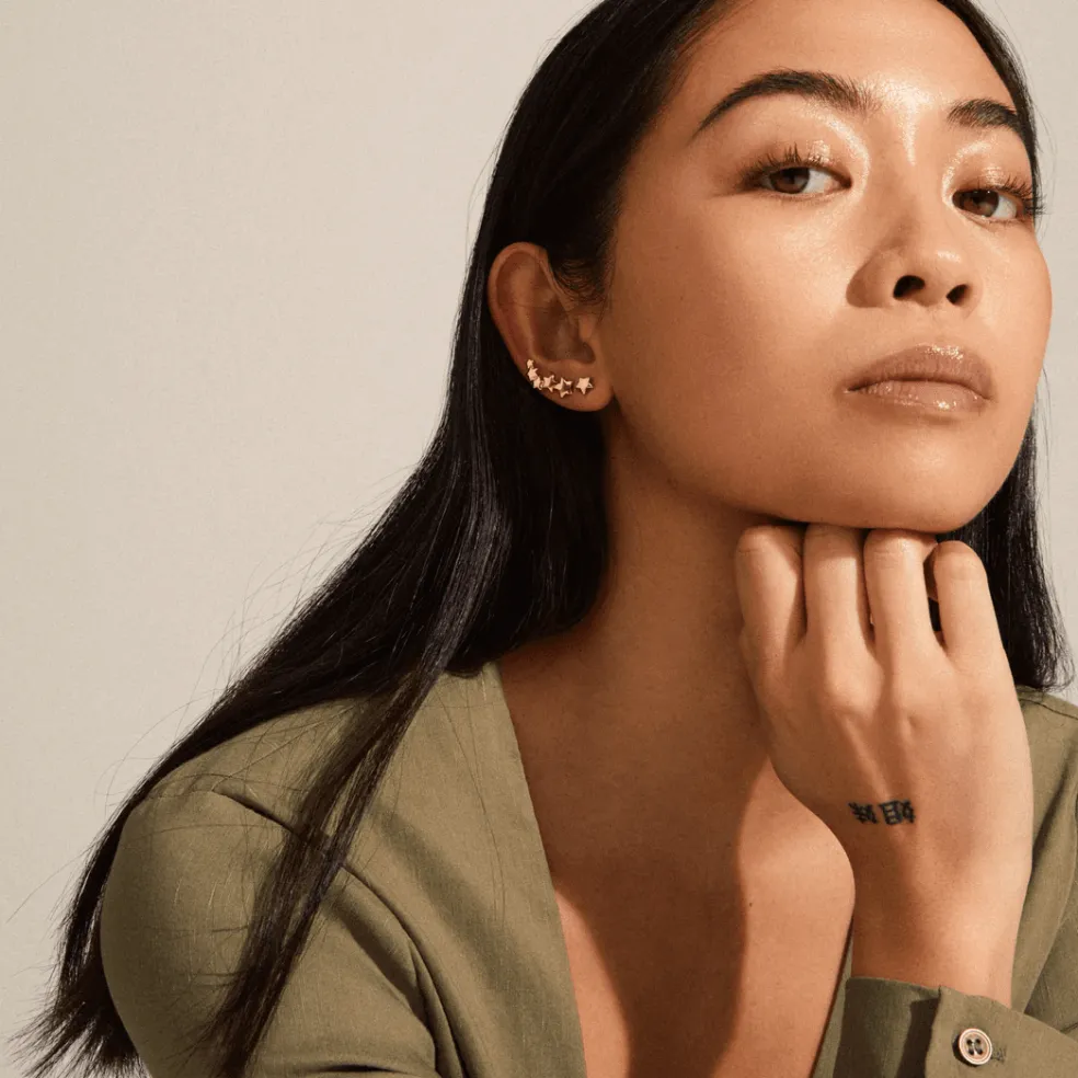 Oemotståndliga guldpläterade örhängen med asymmetriskt stjärnmotiv. Den ena som en diskret liten nål, den andra som ett stjärnfall som böjer sig ner längs örat. En uppsättning örhängen som passar till allt och som snart kommer att bli din nya favoritaccessoar.