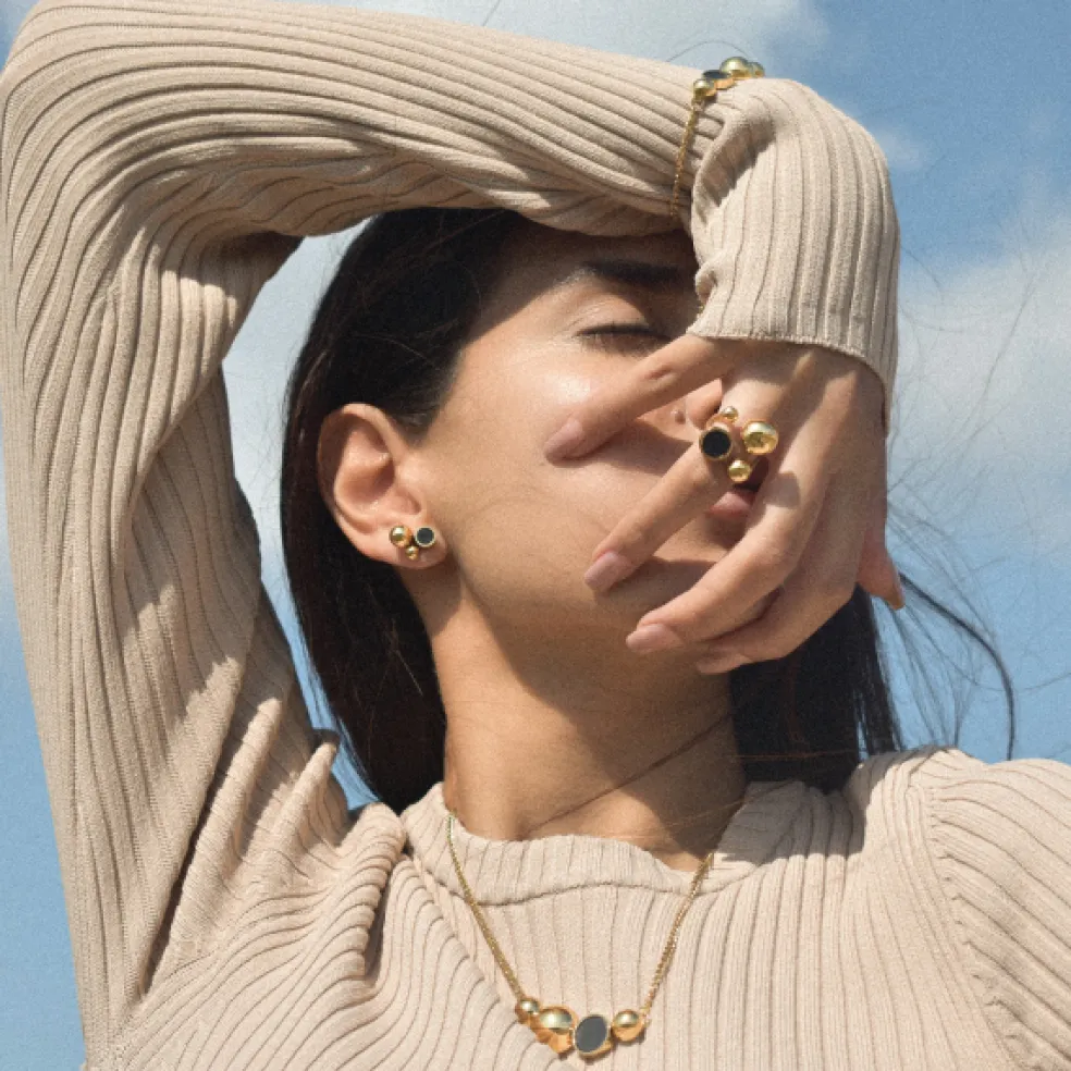 Örhänget Solar är ett reflekterande, skulpturalt smycke med stor wow-faktor! Ett spännande samspel mellan skinande glober och matta ytor, här i guldpläterat stål