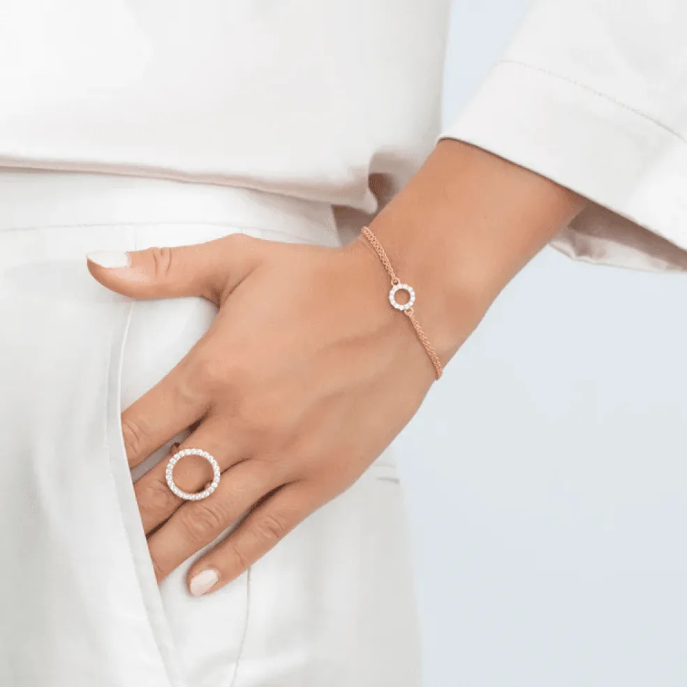Dubbla armkedjor fästa i ett runt hänge, på hänget sitter det klara zirkoniastenar. Modellen heter Biella Piccolo och kommer från varumärket Sif Jakobs.
