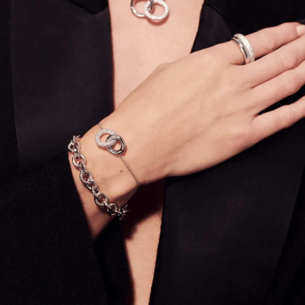 Armbandet pryds av två sammanlänkade ringar, där den ena ringen är helt klädd med gnistrande kristaller för en lyxig touch, medan den andra ringen är slät och polerad, vilket ger en vacker kontrast till armbandet.