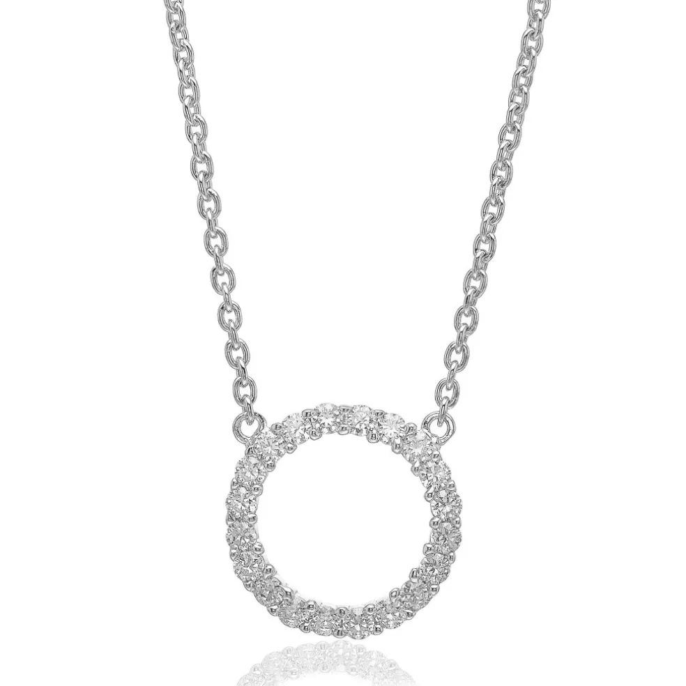 Ett runt hänge, smyckat med klara zirkoniastenar, fångar blicken och sprider en glimt av gnistrande skönhet därhelst du går.