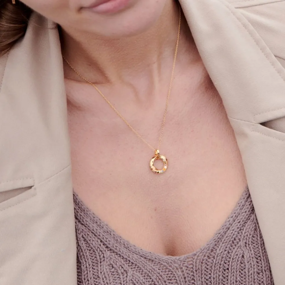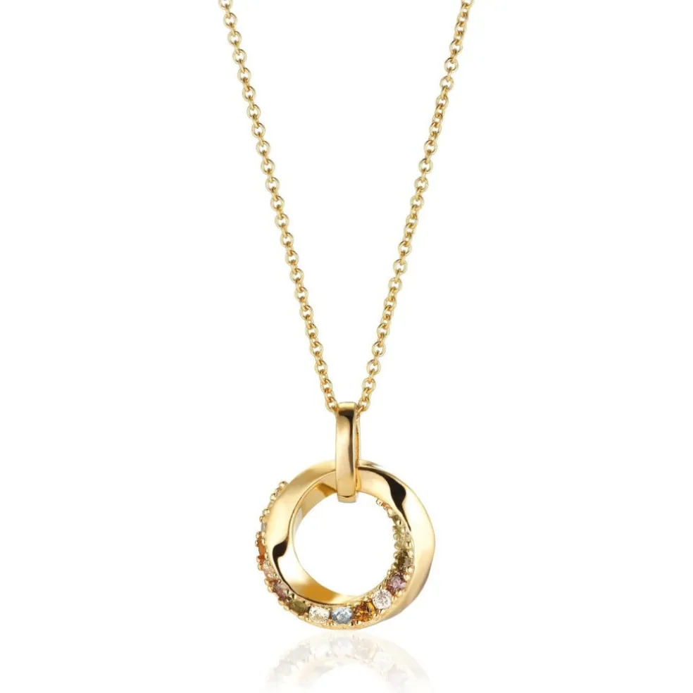 Halsband och hänge i 18 karats gudlplä silver, hänget har en vackert vriden form. På hänget sitter det fasetterade zirkoner i dova färger.