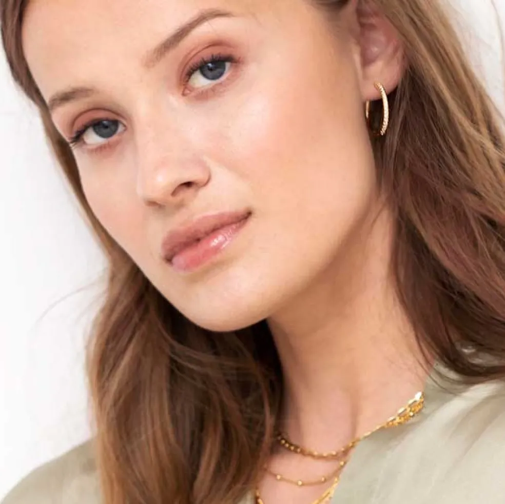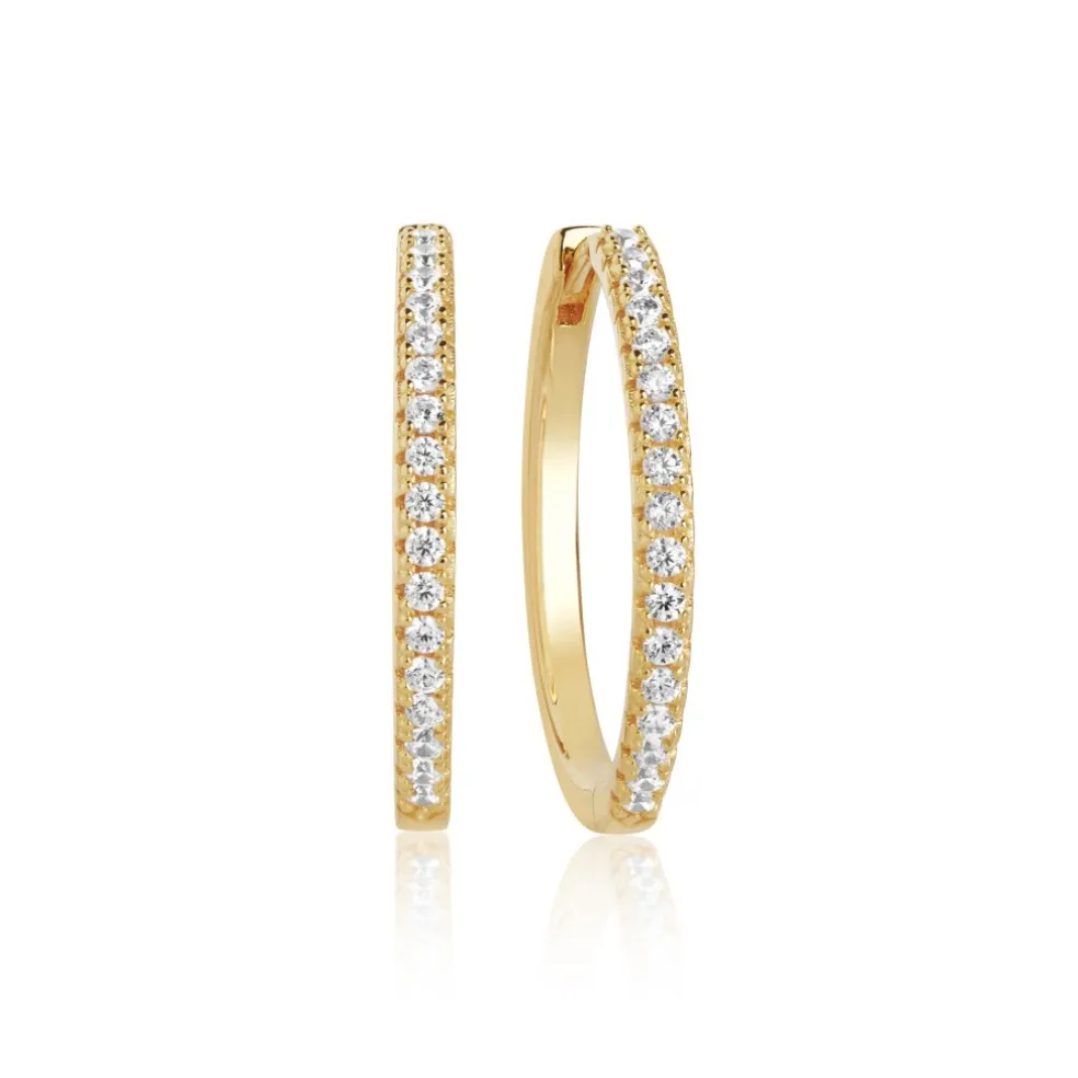 Snygga ringörhängen i 18 karats guldpläterat silver, här med klara zirkoniastenar på. Modellen heter Ellera och ses här i den största storleken X-Grande.
