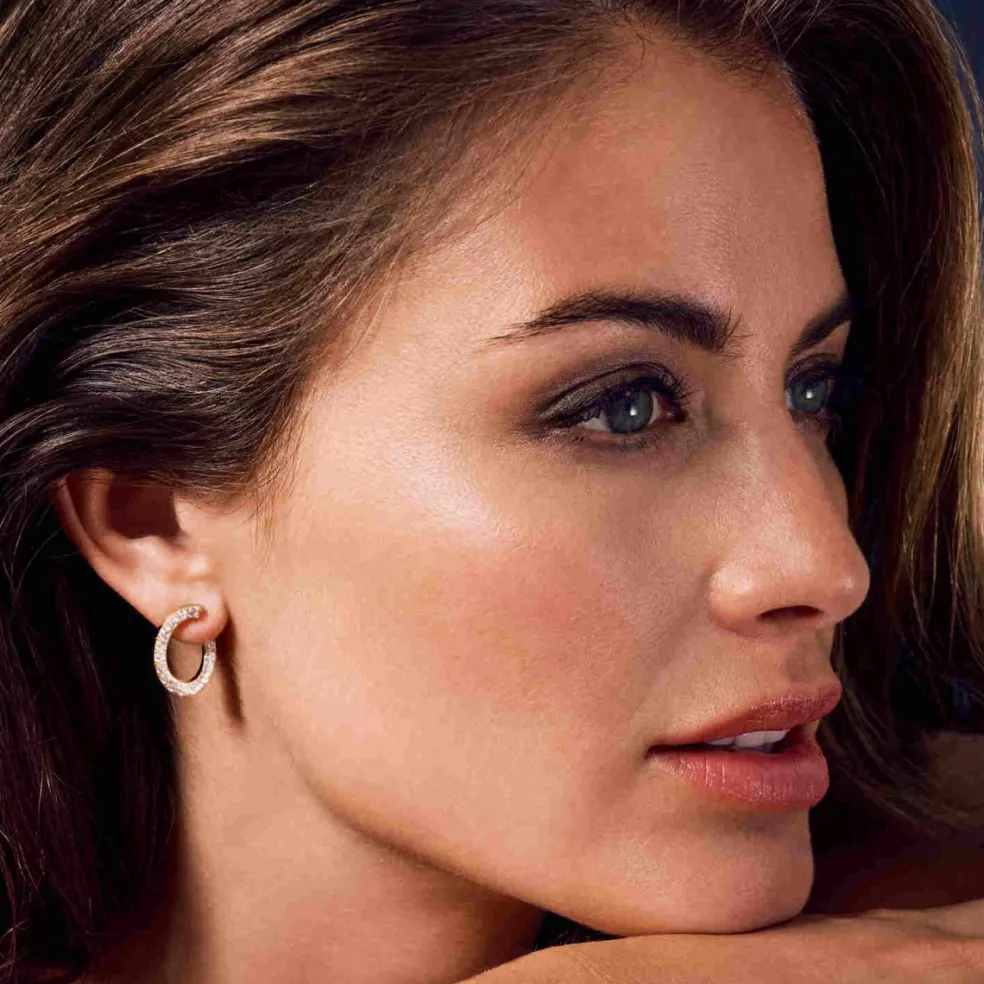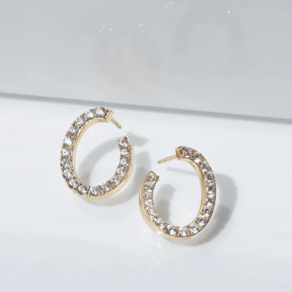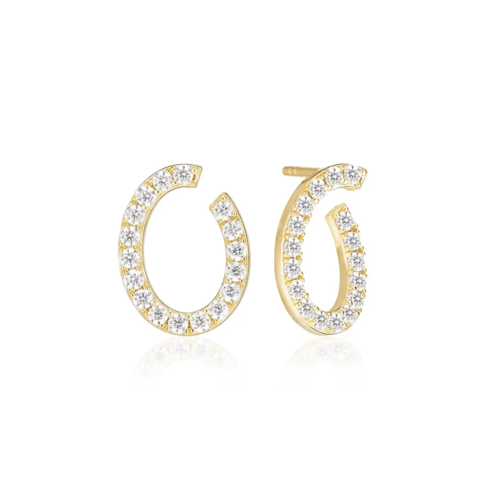 Örhängen av 18 karat guldpläterat silver med polerad yta och handplacerade facettslipade vita zirkoner. Här ser du modellen Ellisse som tack vare sin ovala form som sitter mycket elegant på örat.