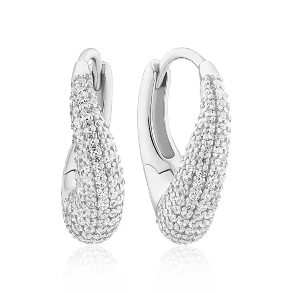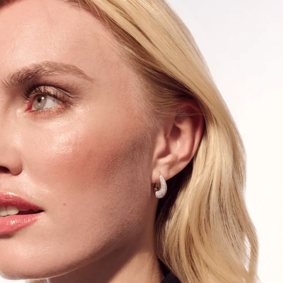 Örhängenas form är en öppen, vriden droppe som mäter cirka 1,8 cm. Den vridna designen tillför en känsla av rörelse, medan den öppna droppformen skapar ett lätt och luftigt uttryck. Varje örhänge är smyckat med handplacerade fasetterade vita zirkoner vars gnistrande yta reflekterar ljus på ett sätt som förstärker örhängenas eleganta design.