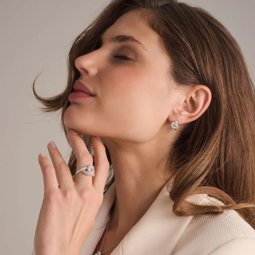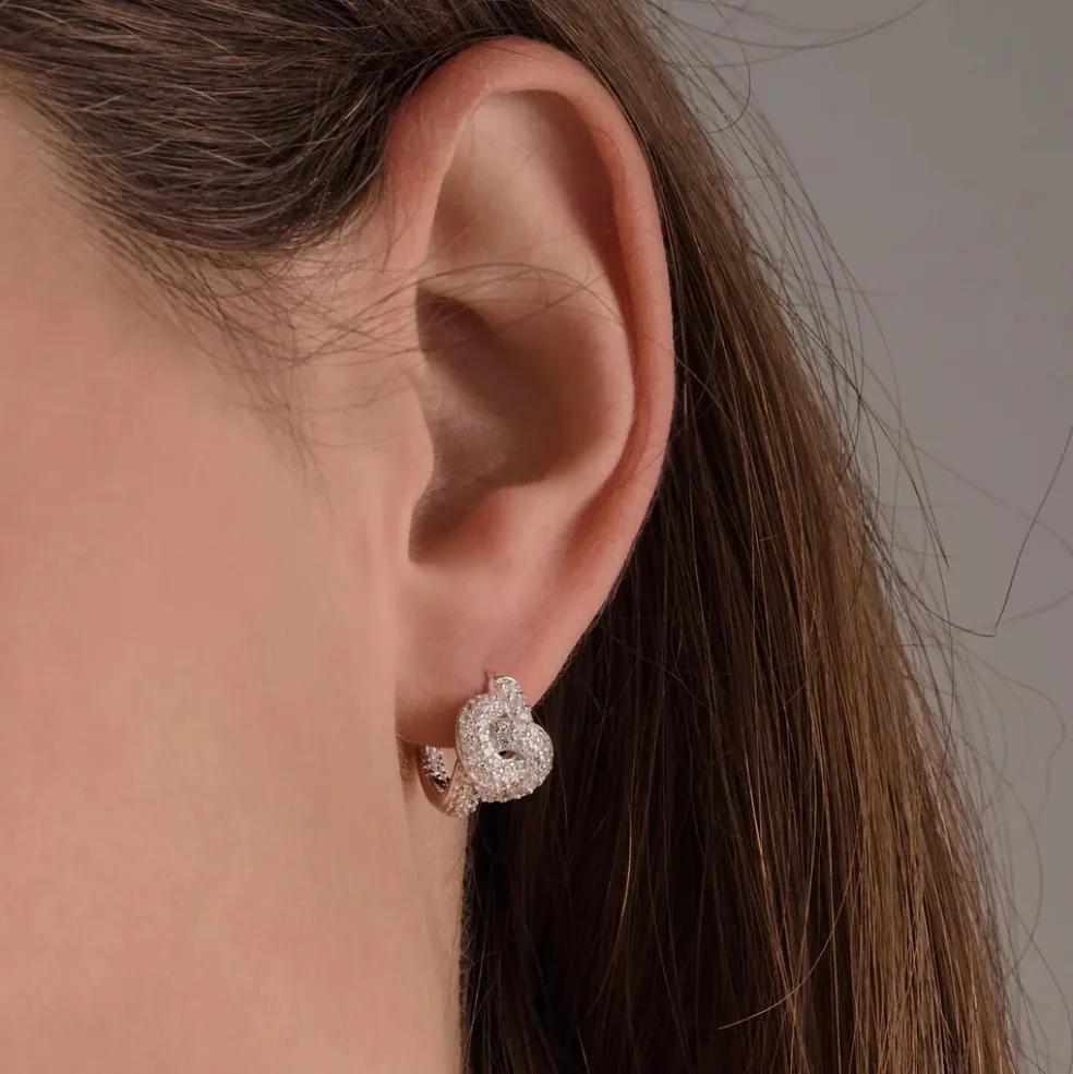 Örhängen i äkta silver från varumärket Sif Jakobs med den populära knuten, serien heter Imperia och ses här i 925 sterlingsilver med rhodiumplätering, polerad yta och infattat med facettslipade vita zirkoner.