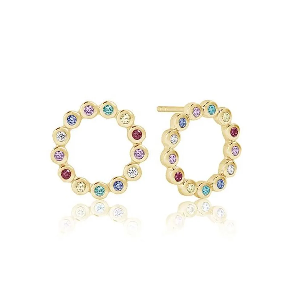 Örhängena är guldpläterade och kristallerna är blandade zirconiastenar som har viss glittereffekt. Den runda formen är mjuk och feminin.