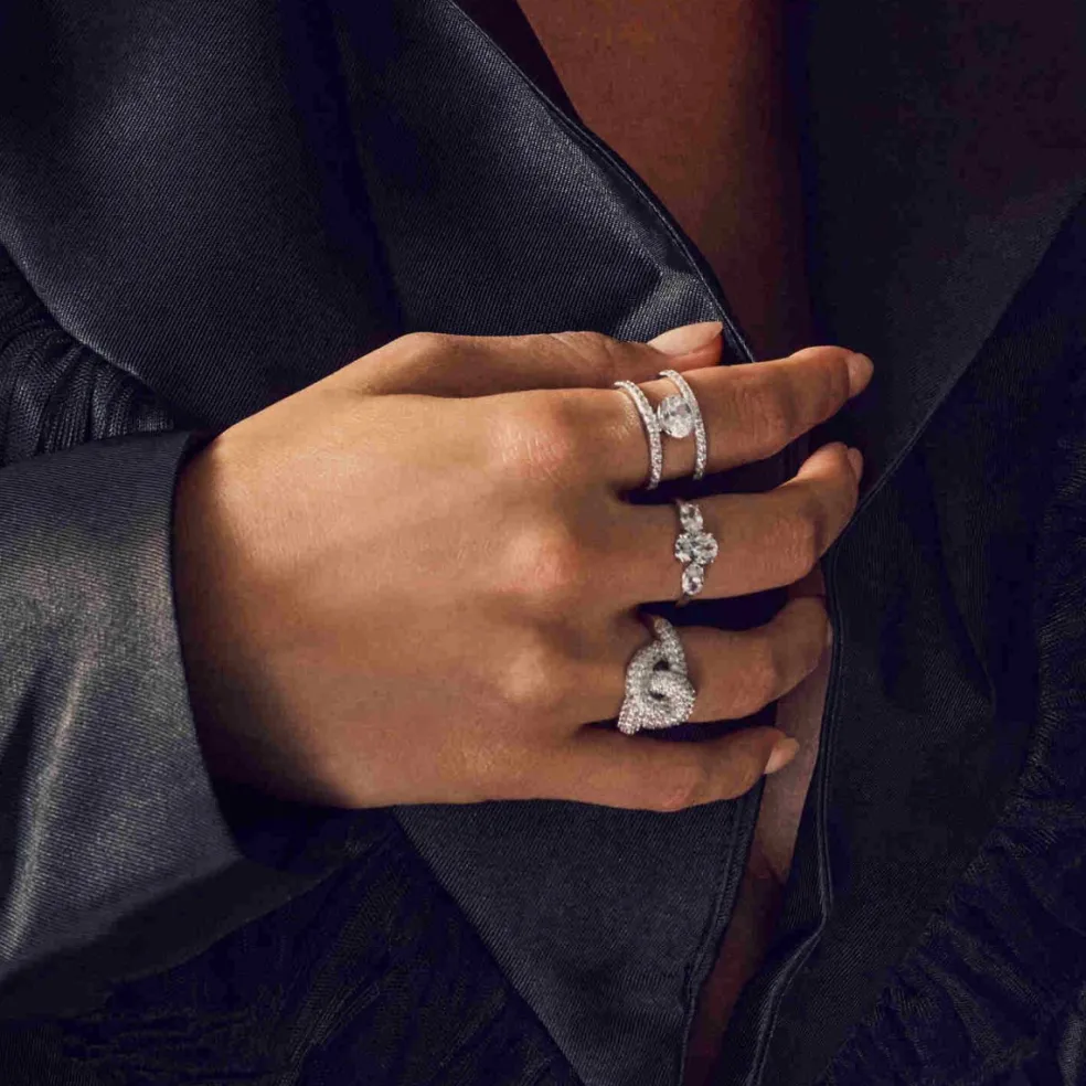 Med en imponerande storlek på cirka 1,5 x 2 cm tar den zirkonia klädda toppen av ringen centrumscenen och blir omedelbart ett samtalsämne. Dess imponerande dimensioner kombinerat med skimmeret av stenarna skapar en hypnotiserande visuell effekt som inte kan ignoreras.