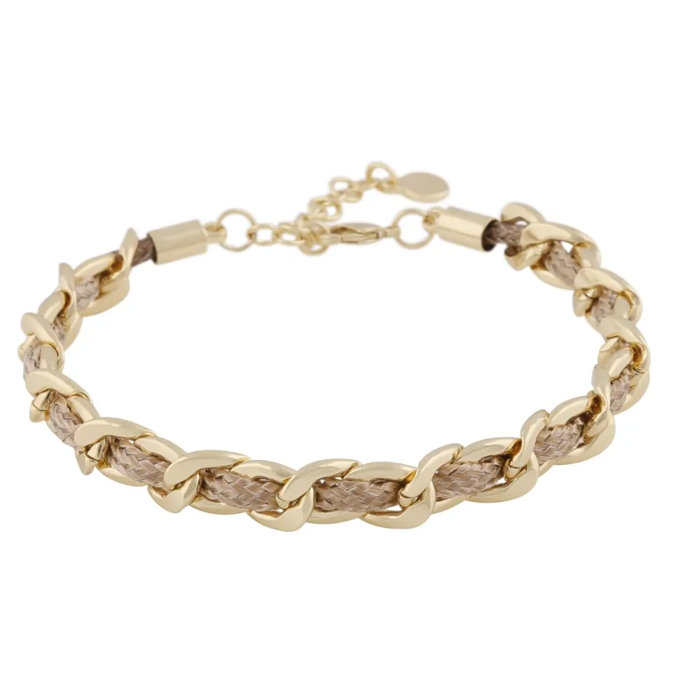 Denna ögatfångande kreation, ett armband i guldpläterad mässing med detaljer av inflätat textilband i beige, är en sann hyllning till konsten att förena material och stil. Tillverkat med precision och passion, erbjuder detta armband en förtrollande blandning av elegans och modernitet.