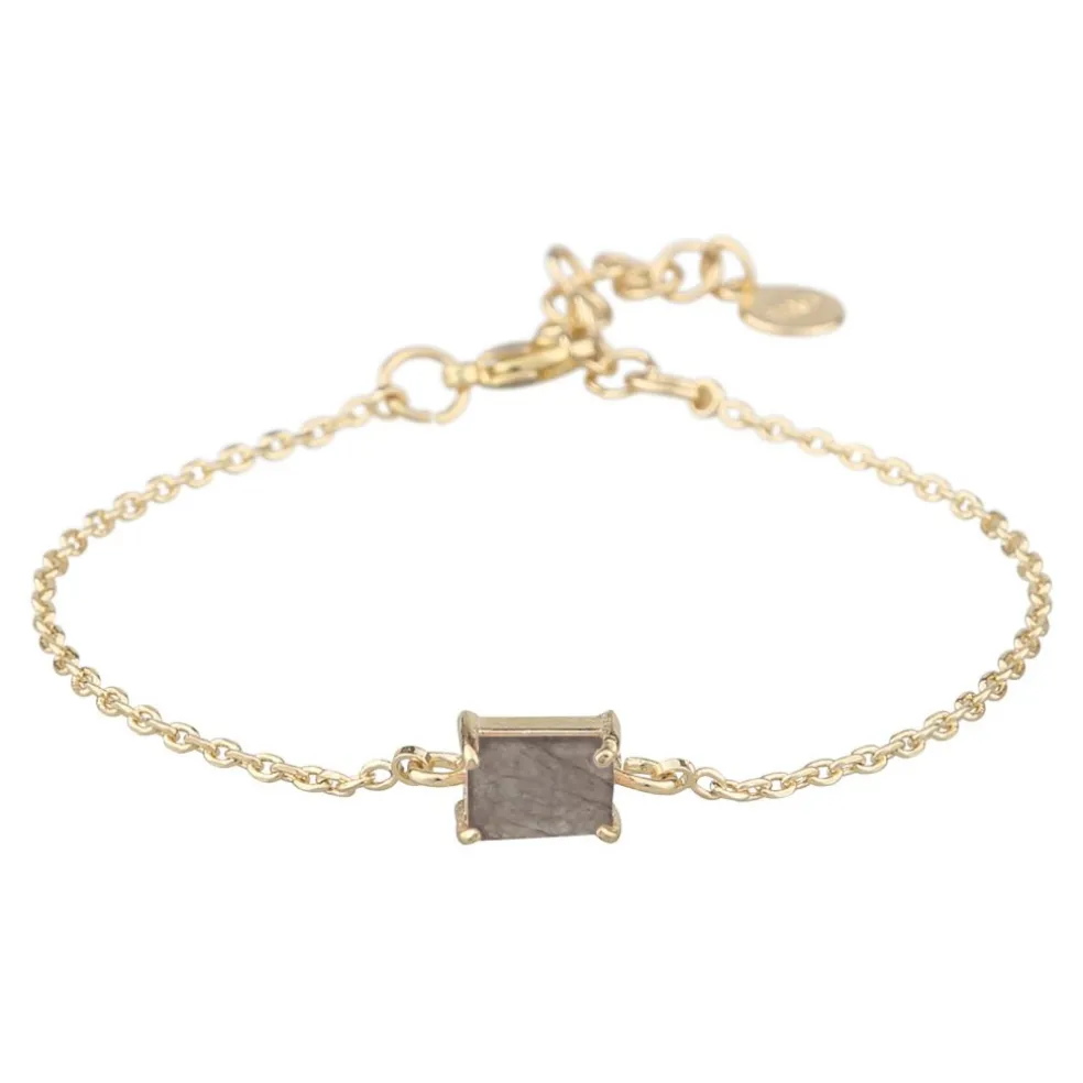 Nätt armkedja i guldplätering med en grå kristall på, modellen heter Satin och kommer från varumärket Snö of Sweden.