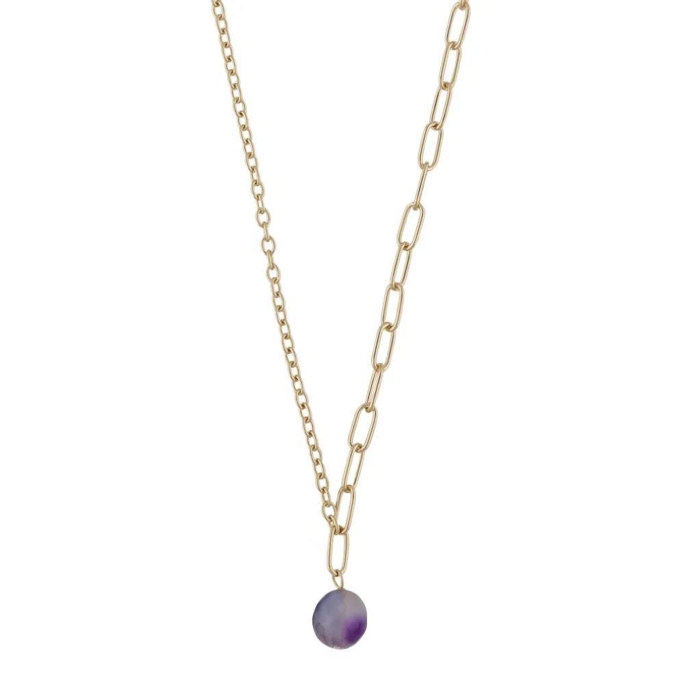 Vackert halsband med hänge i form av en lila agat pärla. Kedjan på halsbandet har två olika länkar som gör halsbandet spännande.
