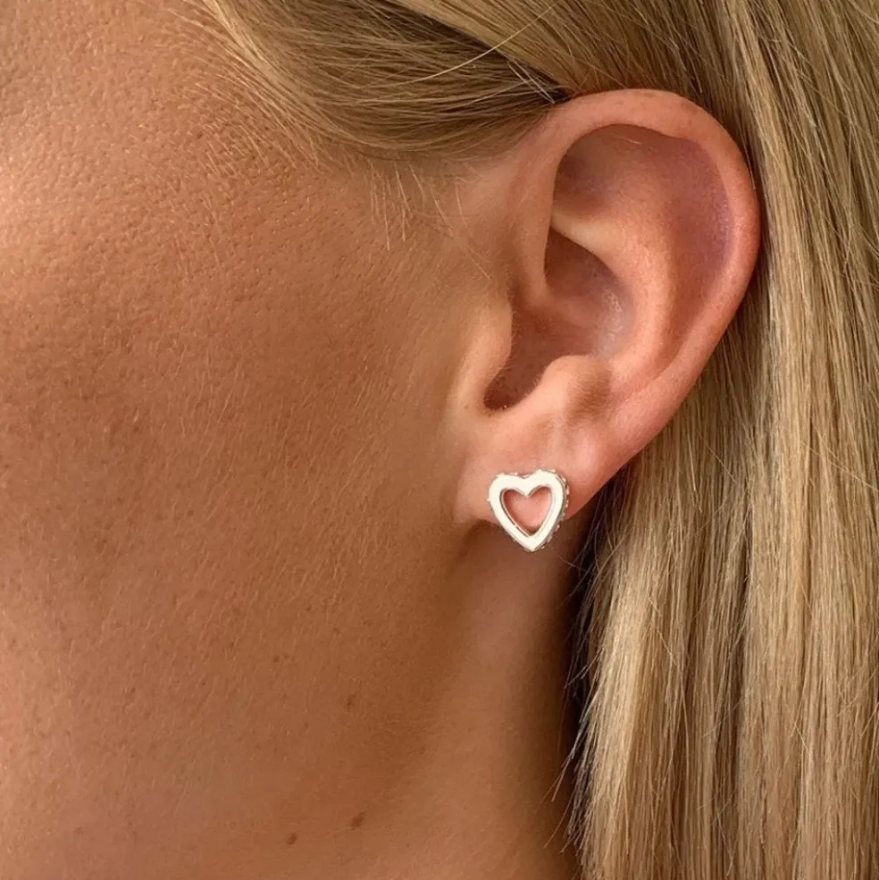 Små hjärtformade studsörhängen med kristallklädd utsida, här i silverfärgad metall med klara kristaller. Modellen kommer från varumärket Snö of Sweden och heter Connected.