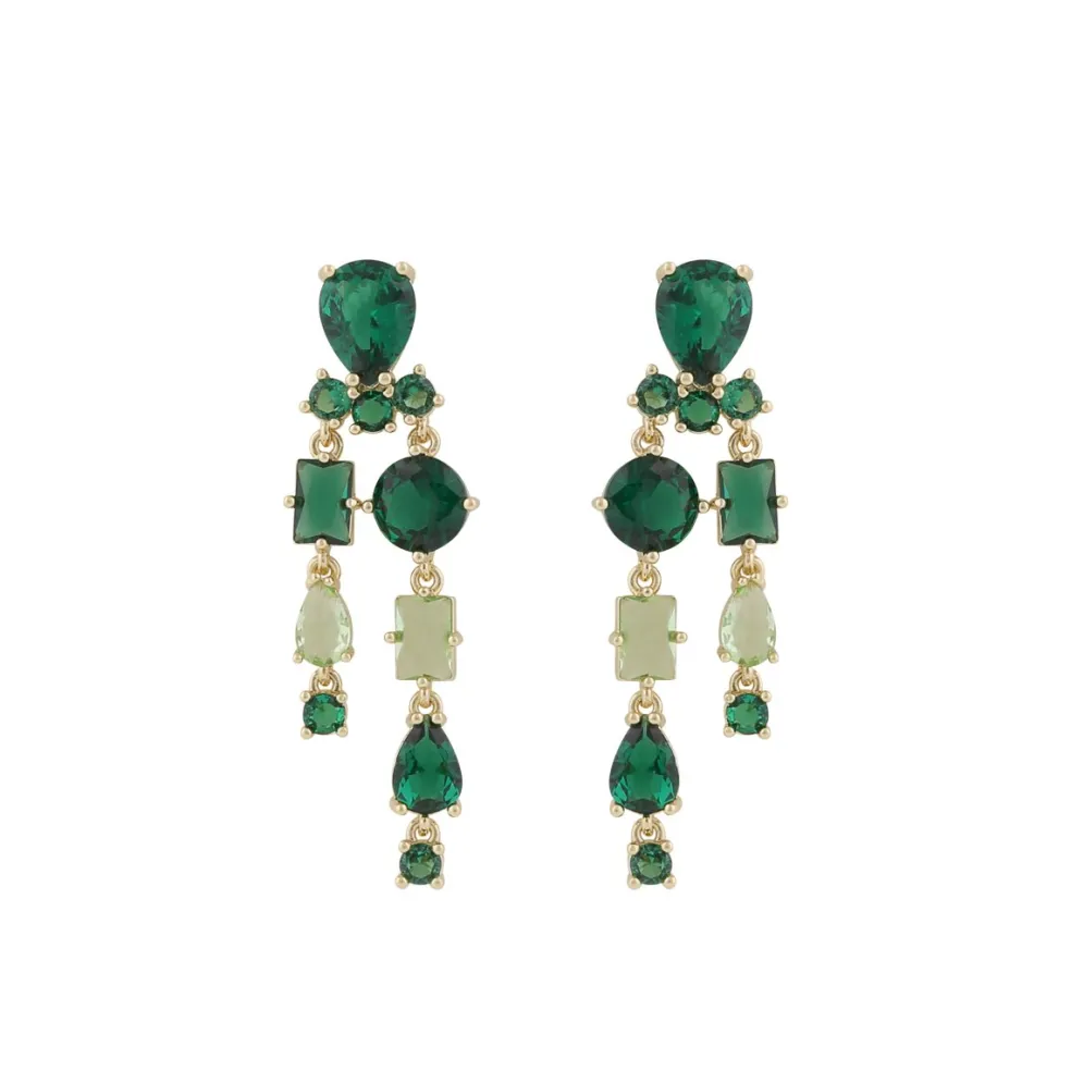 Långa droppörhängen som är noggrant utformade av guldpläterad mässing och prydda med både gröna glaspärlor och cubic zirconia-stenar. Örhängena mäter totalt 4,6 cm i längd, vilket gör dem till en iögonfallande accessoar som elegant ramar in ansiktet.