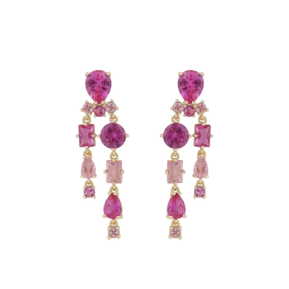 Eleganta örhängen tillverkade av guldpläterad metall och prydda med rosa glaspärlor och cubic zirconia-stenar i olika nyanser. Med en total längd på 4,6 cm är de designade för att vara både iögonfallande och smickrande.