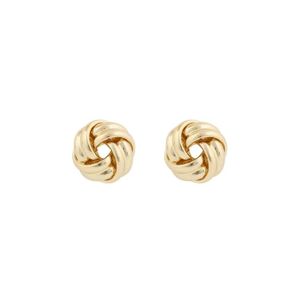 Ett par små örhängen i guldfärg från Snö of Sweden, här med en klassisk knutdesign.