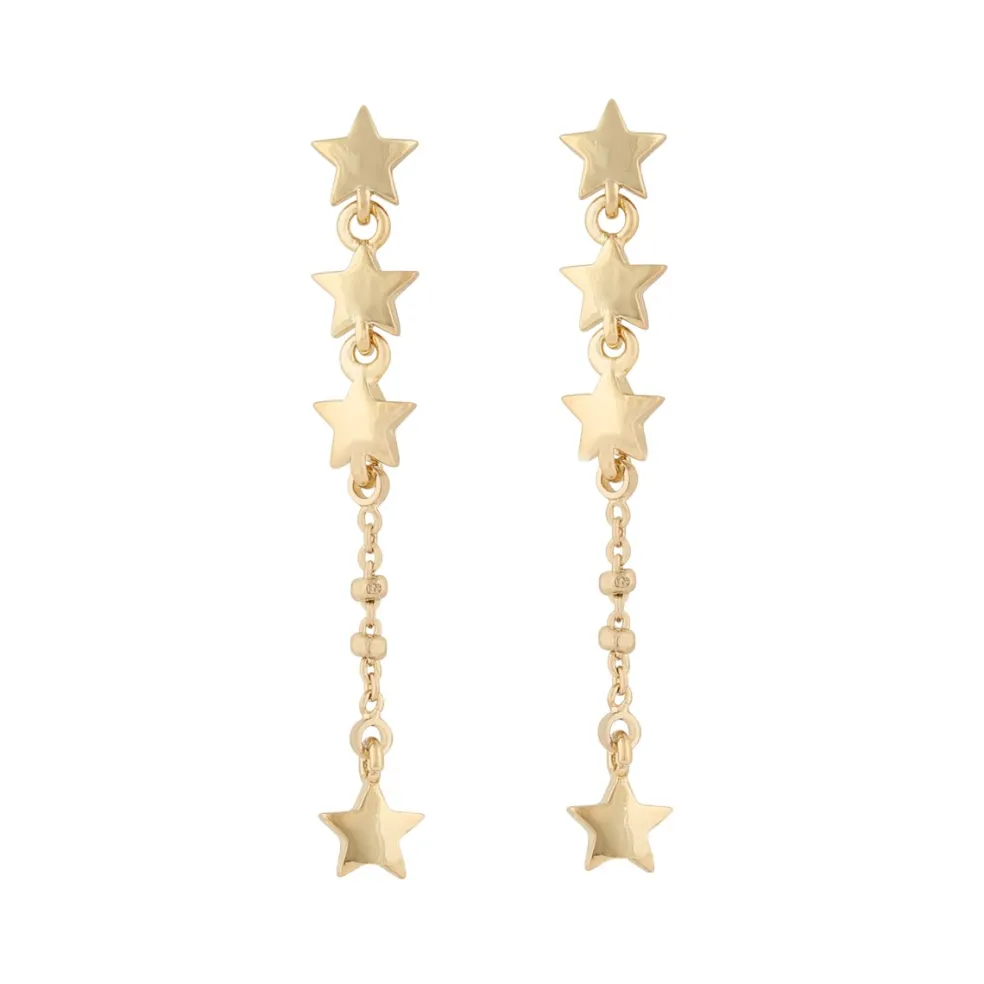Upptäck ett par magiska örhängen som fångar ljuset och drömmer sig bort till natthimlen. Dessa långa örhängen är dekorerade med en rad av små stjärnor, som tycks sväva i luften med sin lätta och graciösa design.