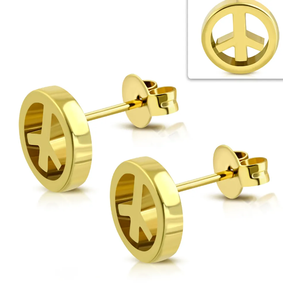 Ett guldfärgat fredstecken i form av ett par örhängen från varumärket The Botilda.