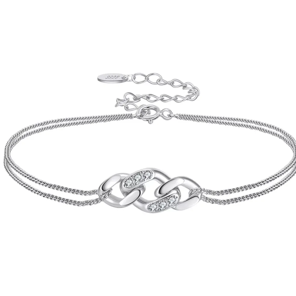 Nätt armband i dubbla rader med tre sammansatta kedjelänkar. På den mittersta länken sitter det fler små cubic zirkonier i AAAA-kvalité.