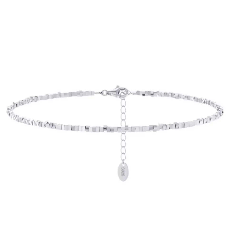 Upplev magin och elegansen med The Botildas skimrande fotlänk, skapad i äkta silver och designad för att fånga ögat med sin glans. Denna fotlänk är utformad med små, glittrande kuber som mäter endast 2 millimeter vardera, vilka tillsammans bildar ett vackert och blänkande mönster. Varje liten kub fångar ljuset och reflekterar det på ett sätt som ger en mjuk, lysande effekt runt din fotled.