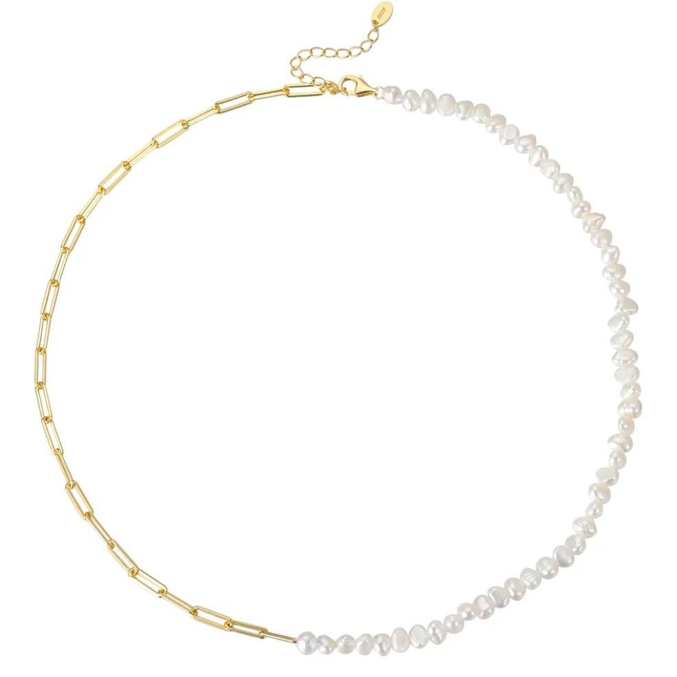 Elegant halsband i en fin kombination med en klassisk kedja och vita sötvattenspärlor.