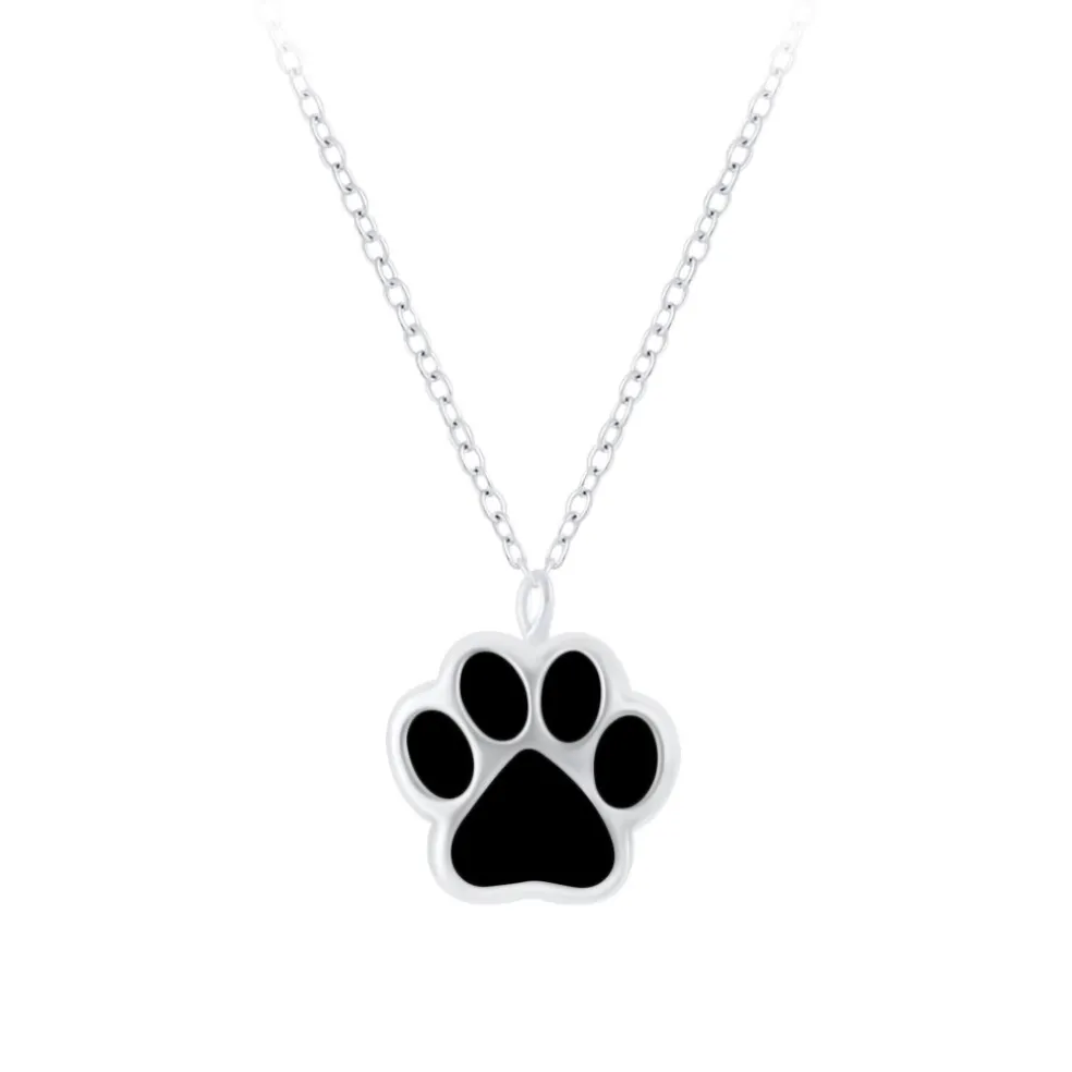 Alla The Botildas smycken är allergivänliga och helt säkra för både barn och vuxna, just detta halsband är tillverkat i äkta silver med tassen i svart emalj.