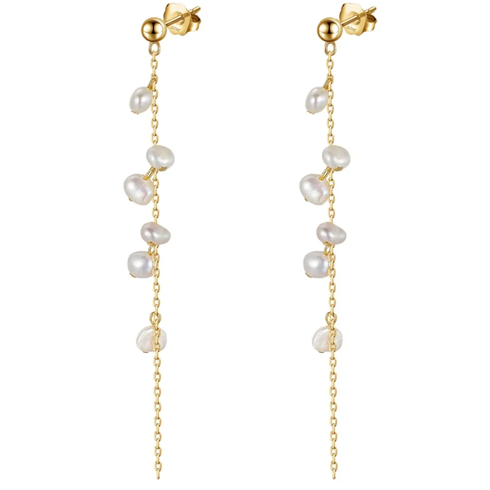 Långa pärlörhängen i guldpläterat silver med vita sötvattenspärlor. Pärlorna är oregelbunda i formen och varje örhänge är unikt.