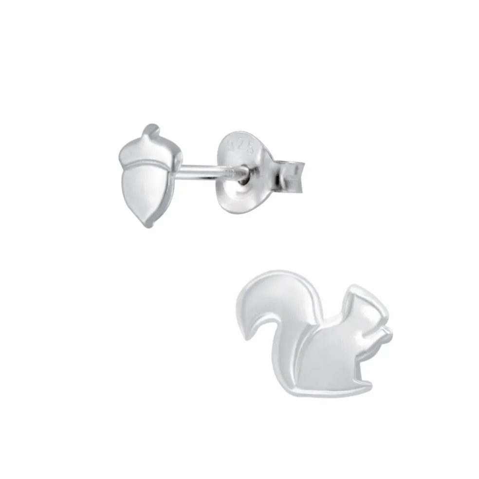 Ett par stiftörhängen i äkta silver med en ekorre och ett ekollon.
