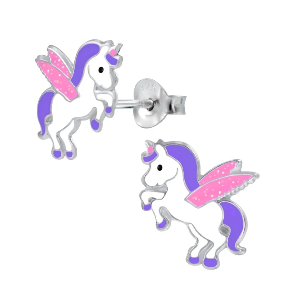 Örhängen i äkta silver och färgad emalj i form av en enhörning, just denna enhörning har lila man och rosa vingar.