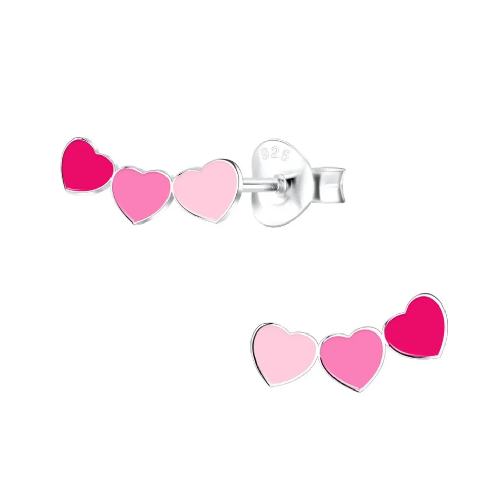Tre hjärtan på rad i tre olika rosa nyanser, tillverkat i äkta silver med färgad emalj.