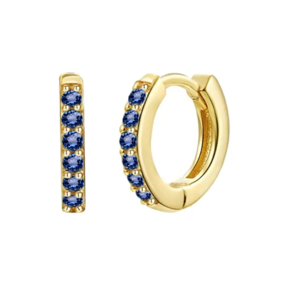 Små nätta ringörhängen i guldpläterat silver med blåa kristaller på, modellen heter Hoop XS och kommer från varumärket The Botilda.