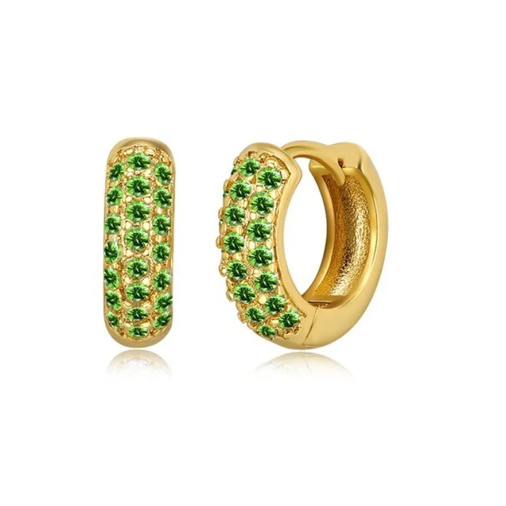 Gnistrande ringörhängen i guldpläterat silver med gröna kristaller på, modellen heter Huggie och varumärket The Botilda.