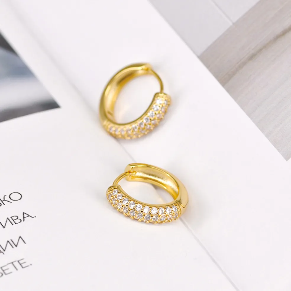 Gnistrande ringörhängen i guldpläterat silver med klara kristaller på, modellen heter Huggie och varumärket The Botilda.