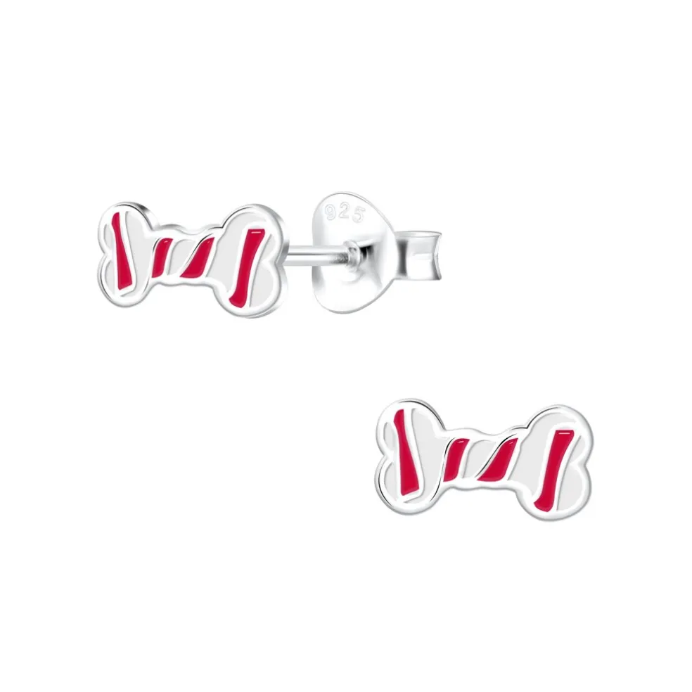 Små stiftörhängen i äkta silver, här i form av ett hundben i röd och vit emalj.