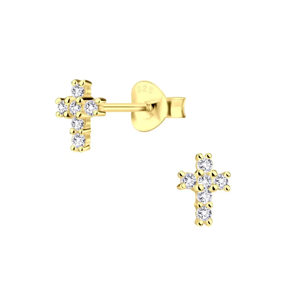 Guldpläterade silverörhängen i form av ett kors med klara kristaller på.