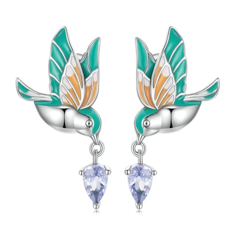 Örhängen i form av en liten kungsfågeln ute på en flygtur och suger näktar från en lila "blomma".