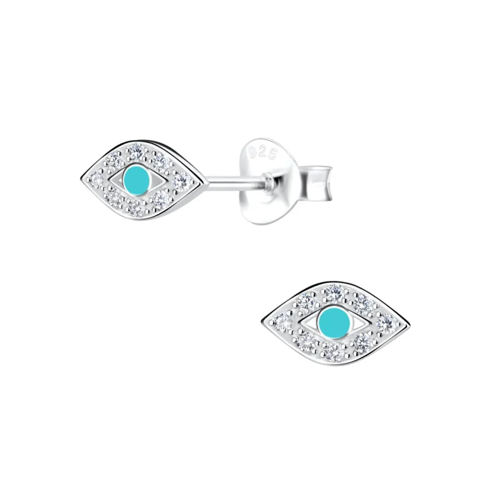 Örhängen i äkta silver i form av Nazars öga, här med gnistrande kristaller och turkose emalj på.