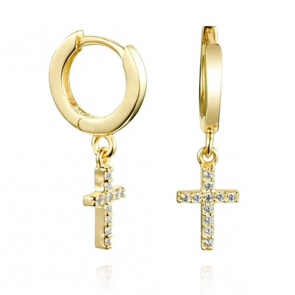 Små ringörhängen med ett kristallklätt kors på, allt tillverkat i äkta silver med guldplätering och klara kristaller.