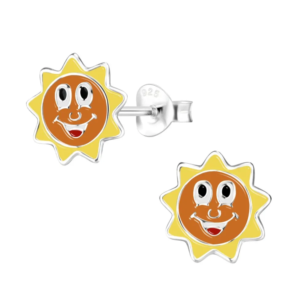 Örhängen i äkta silver med färgad emalj, här med motiv av en skinande glad sol. Örhänget kommer från varumärket The Botilda och deras kollektion "travellers".