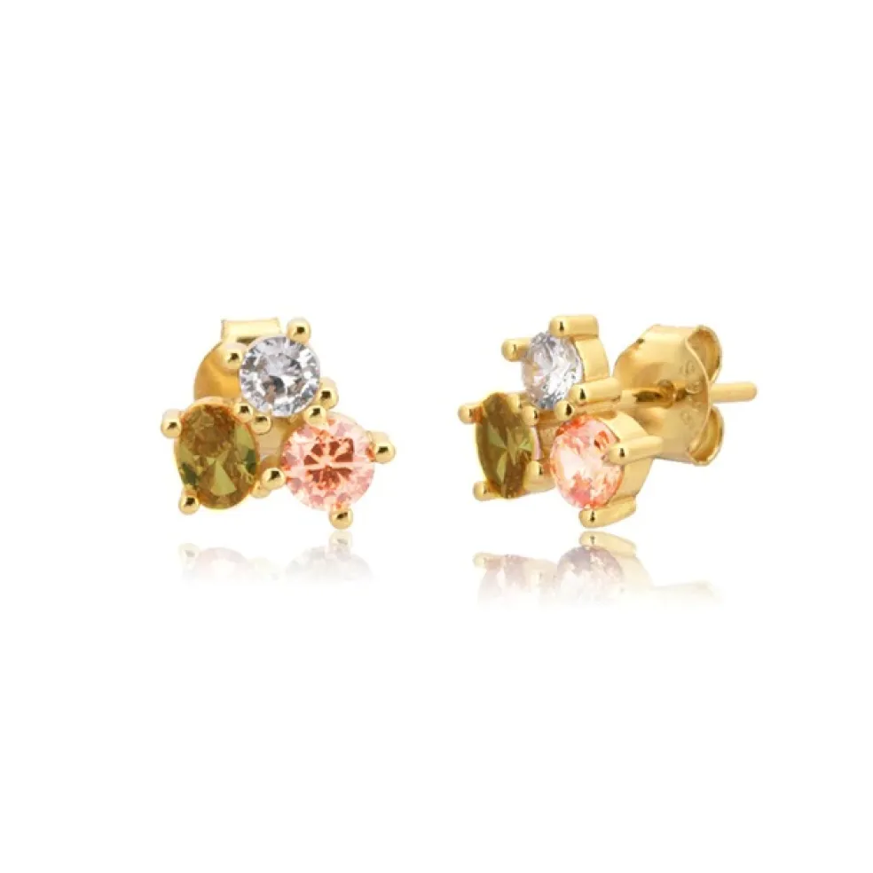 Stiftörhängen i guldpläterat silver med tre små kristaller på i mixade färger, modellen har fått namnet Trio och kommer från varumärket The Botilda.