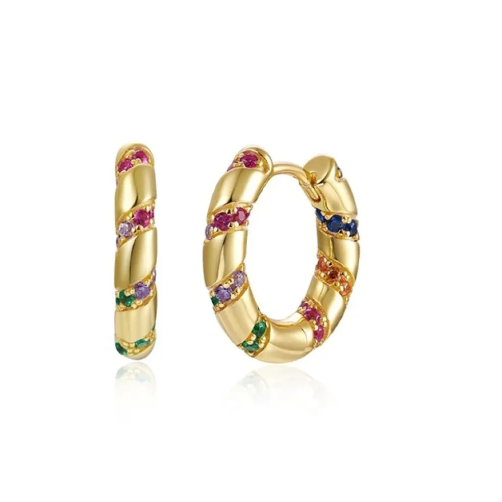Riktigt fina ringörhängen i guldpläterat silver med kristaller i mixade färger på, modellen heter Twist och varumärket The Botilda.