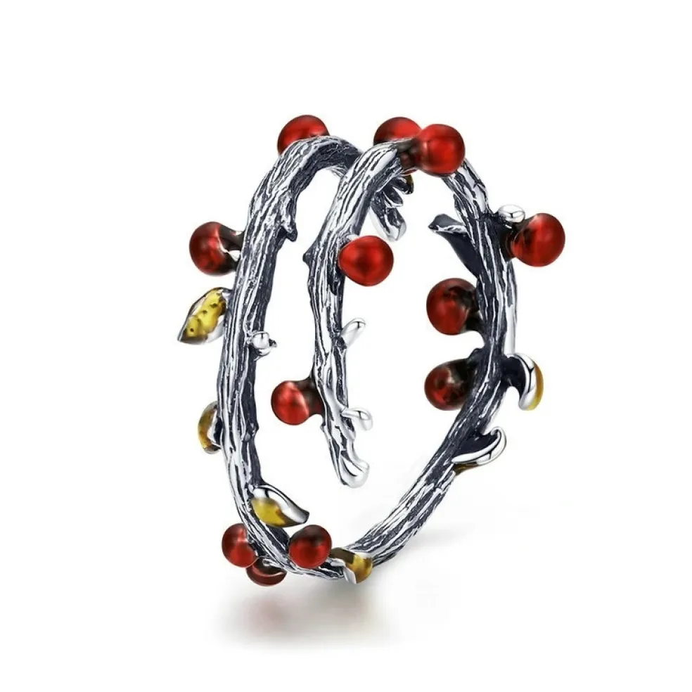 Ring i äkta silver i form av en gren med röda bär och gula blad på, ett mästerverk till ring som garanterat väcker uppmärksamhet.