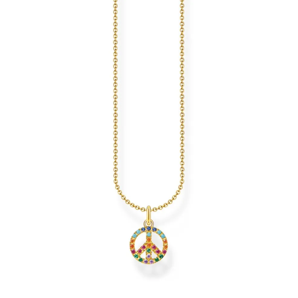 Det fina halsbandet med hänge i form av ett fredstecken består av 925 sterlingsilver och är försett med plätering i 18K gultguld. Fredstecknet pryds av för hand infattade smyckesstenar i blått, grönt, turkos, rosa, orange och violett.