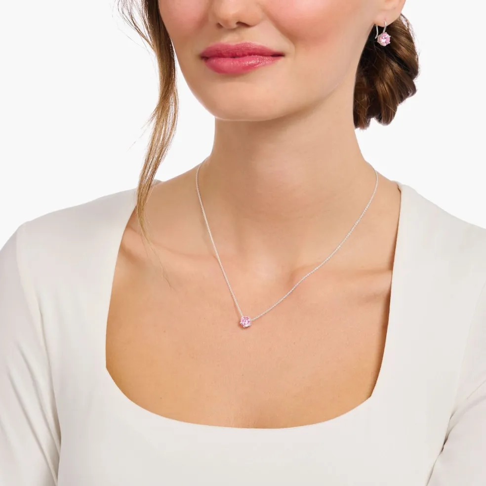 Ett halsband från varumärket Thomas Sabo, tillverkat av återvunnet silver. Här i en enkel och tidlös design med sin rosa kristall i kloinfattning. Den noggrant slipade stenen fångar ljuset på ett förtrollande sätt och ger halsbandet en gnistrande charm.