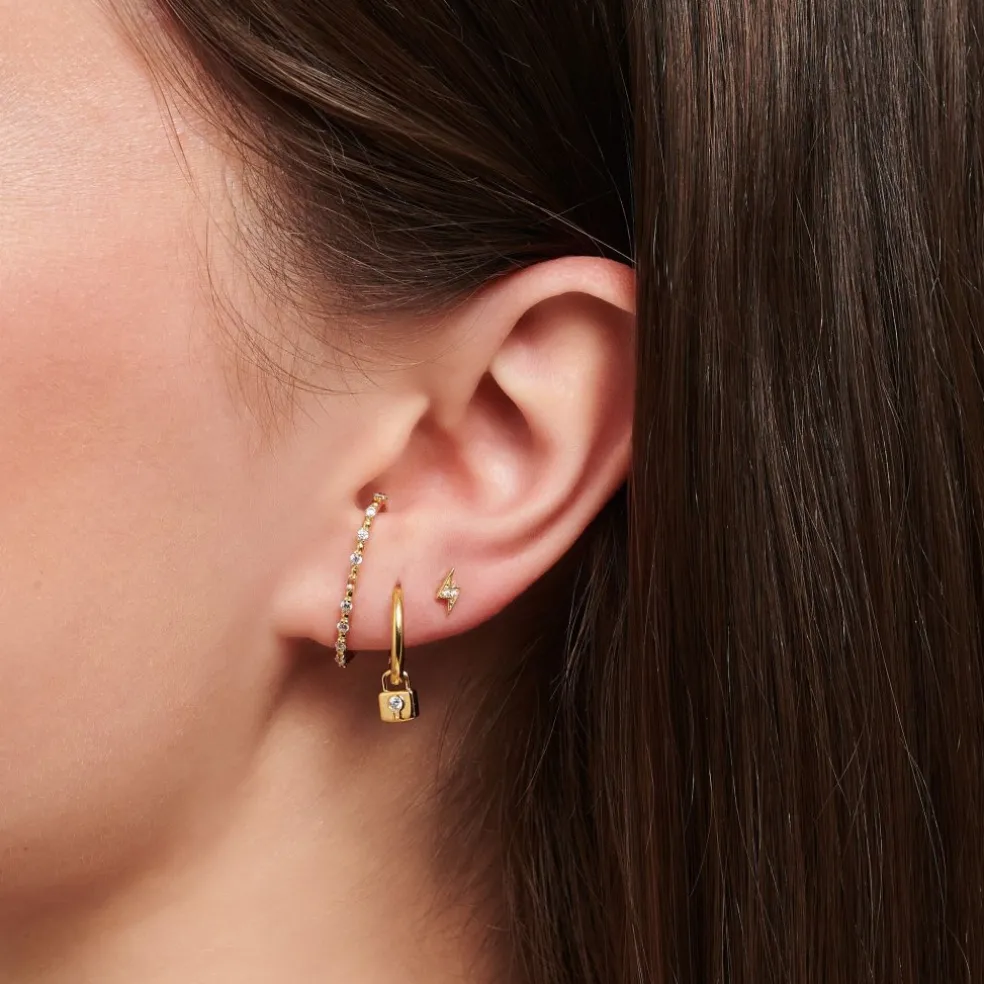 Det här enskilda stiftörhänget i 18 karats guldplätering verkar elektriserande! Motivet är gestaltat i kraftfulla linjer och prytt med gnistrande zirkoniastenar i klofattningar. Stiftörhänget med blixt utstrålar därför laddad energi och skapar en självsäker accent på örat.