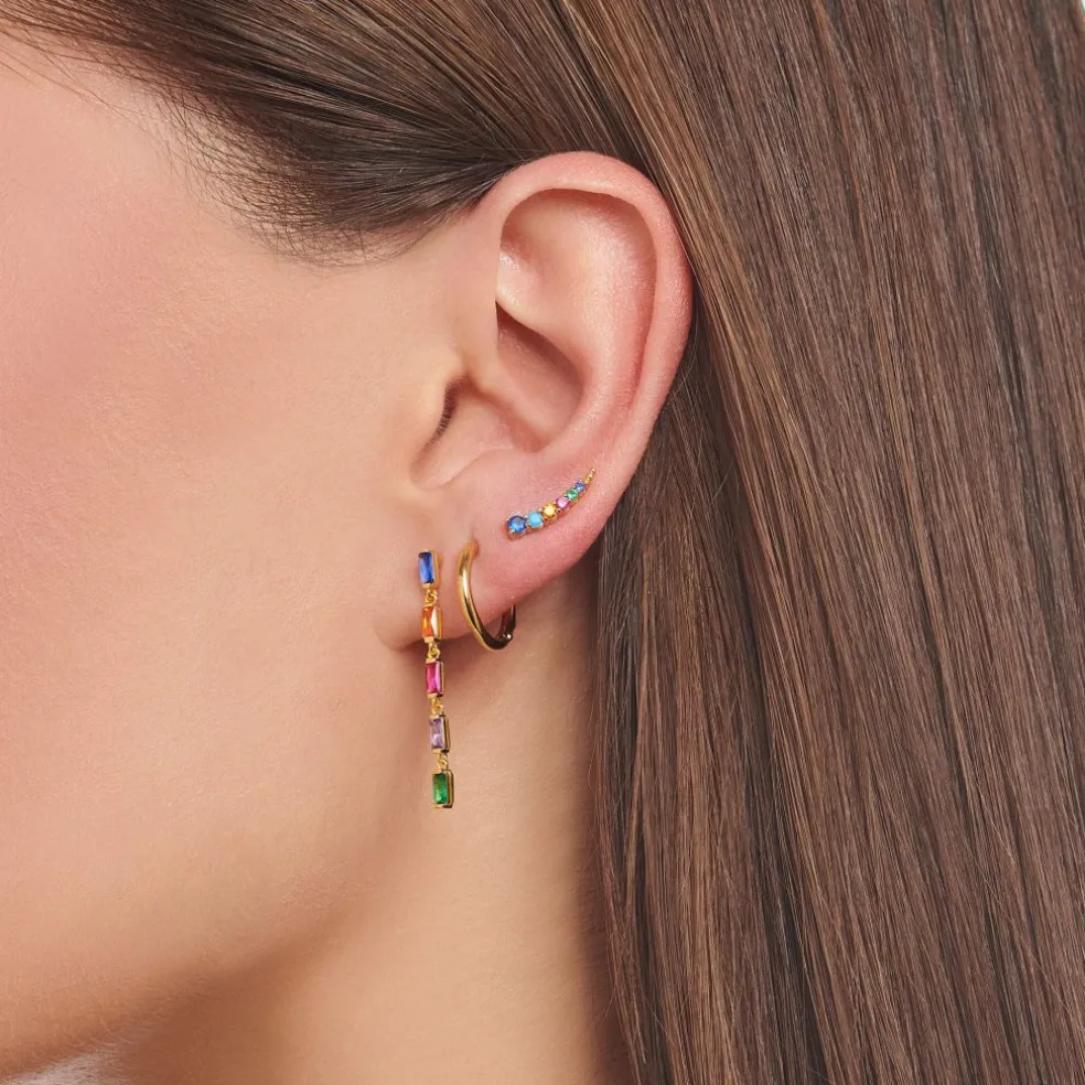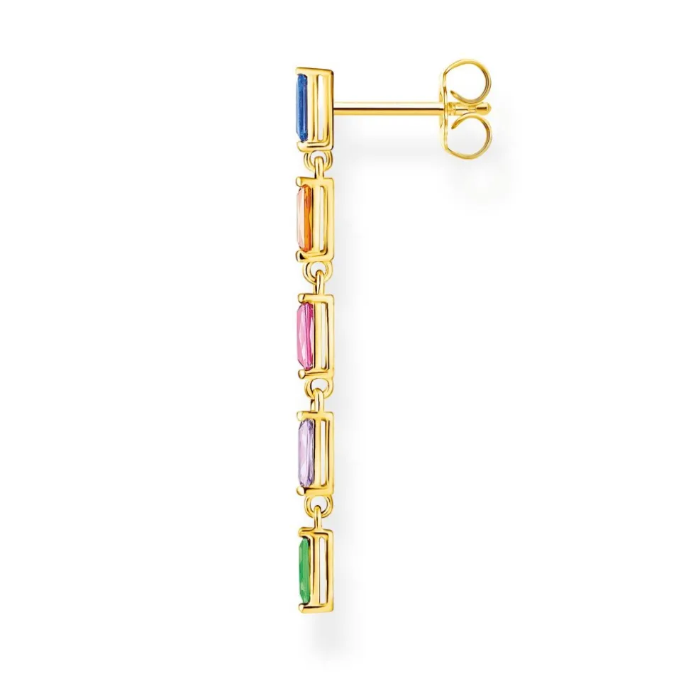 Fem regnbågsfärgade smyckesstenar i briljant baguetteslipning är höjdpunkten på detta långa singlestiftörhänge.