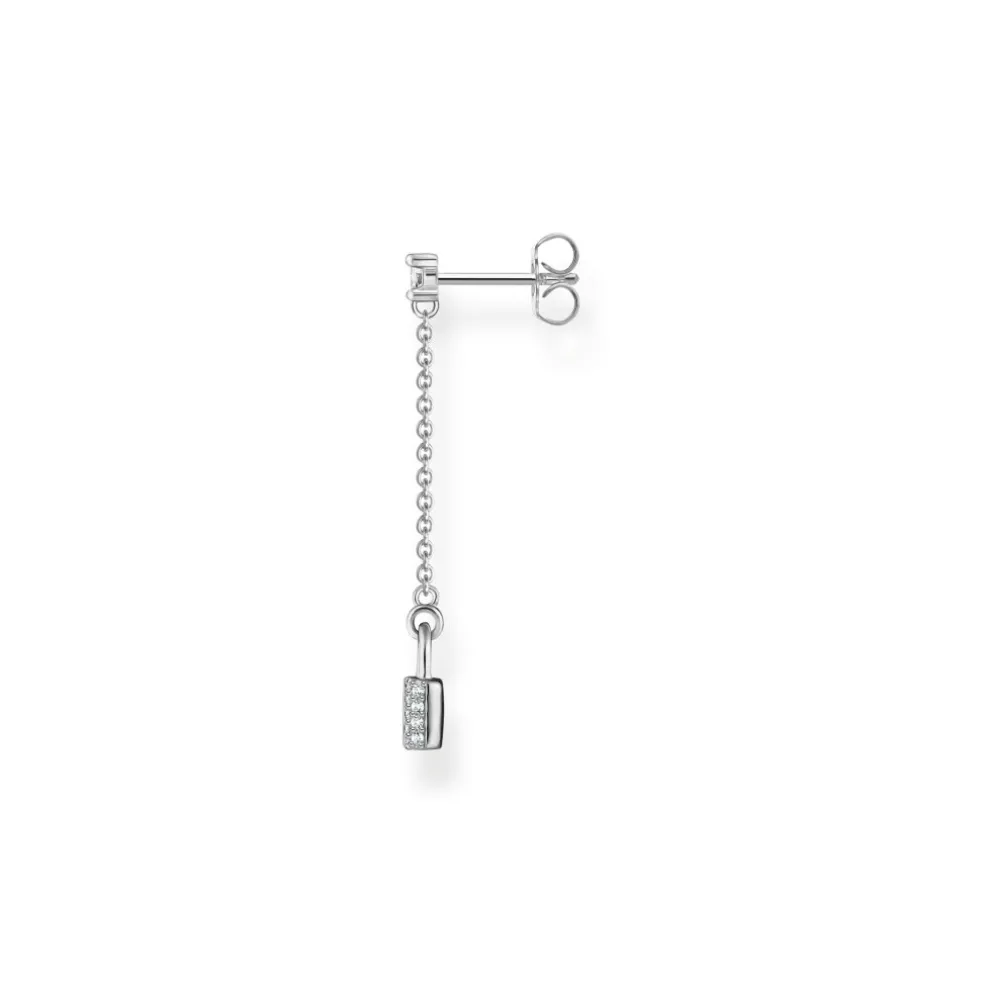 En vit, rundslipad zirkoniasten är förbunden med ett hänglås via ett finlänkat kedjeelement. Hänglåset är prytt med vit zirkonia-pavé och svänger lätt vid rörelser.