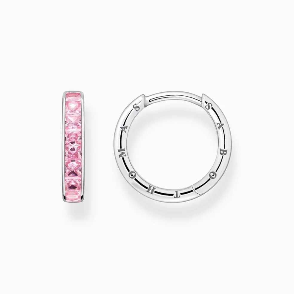 Creolerna är exklusivt tillverkade av 925 sterlingsilver och prydda med glittrande, handplacerade zirkoniastenar. De eleganta prinsesslipade stenarna strålar i en glamorös rosa ton. Den öppna kanalinfattningen intensifierar stenarnas färgskiftningar när ljuset faller på dem. Sidorna pryds av en THOMAS SABO-gravyr.
