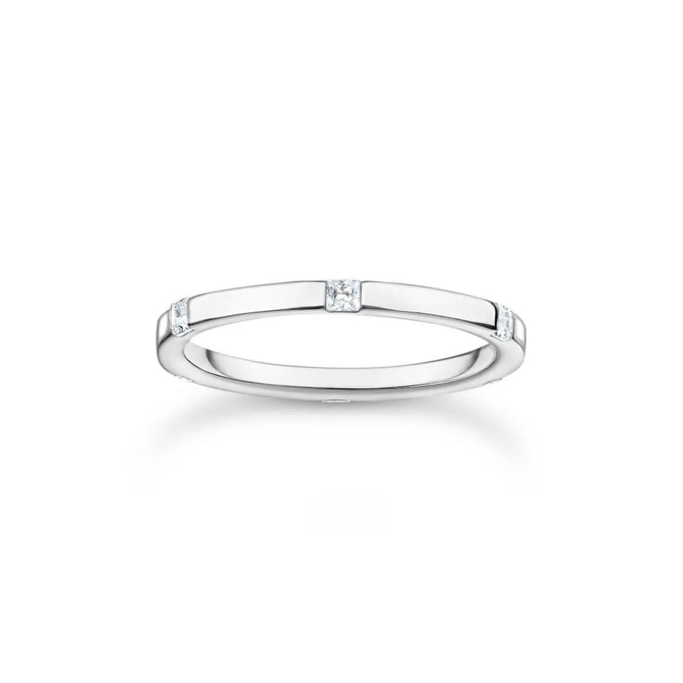 En eleganrt ring i högkvalitativt 925 sterlingsilver som förtrollar med sex vita, gnistrande zirkoniastenar. Dessa stenar har en kvadratisk form och är infattade i bezelfattningar runtom ringskenan.