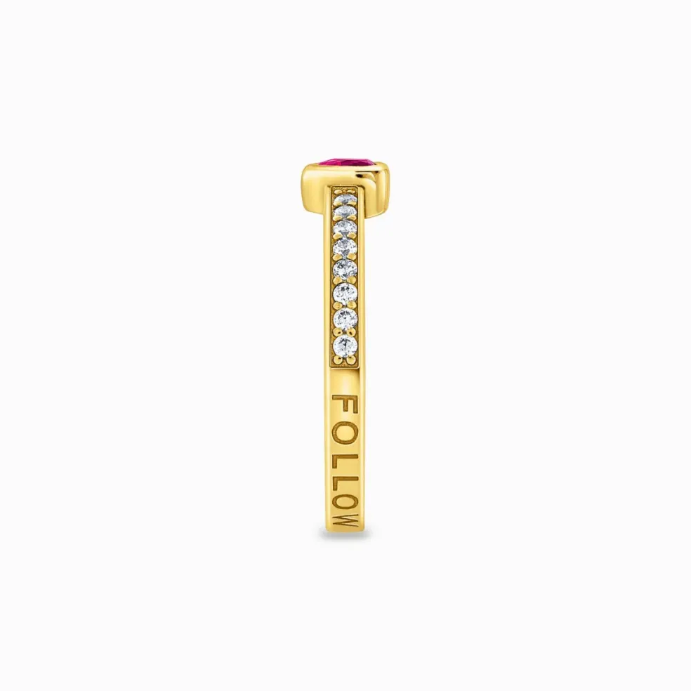Med en hjärtslipad röd sten som strålande mittpunkt, symboliserar denna ring djupa känslor och innerlig passion.