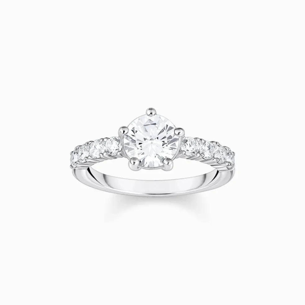Solitärringen som förtrollar med sin glamourösa design är tillverkad i högkvalitativt 925 sterlingsilver. En stor vit, rundslipad zirkoniasten skapar ett sofistikerat skimmer i ringens mitt och även ringskenan glittrar av vita zirkoniastenar. Den öppna kloinfattningen gör att stenarna skiftar i färg extra intensivt när ljuset faller på dem.